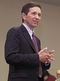 | In his speech to the Southern California Americans for Democratic Action, criticizing Bush's conduct of the war on terrorism, Dennis Kucinich set the crowd on its ear--one standing ovation after another. Sure, they were all liberals, but what counted was the response on the Internet. The Cleveland Congressman's e-mail box was stuffed to overflowing with 20,000-plus enthusiastic letters. -- Studs Terkel, The Nation, May 6, 2002. | [Kucinich's] tactics are